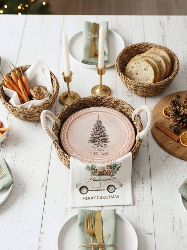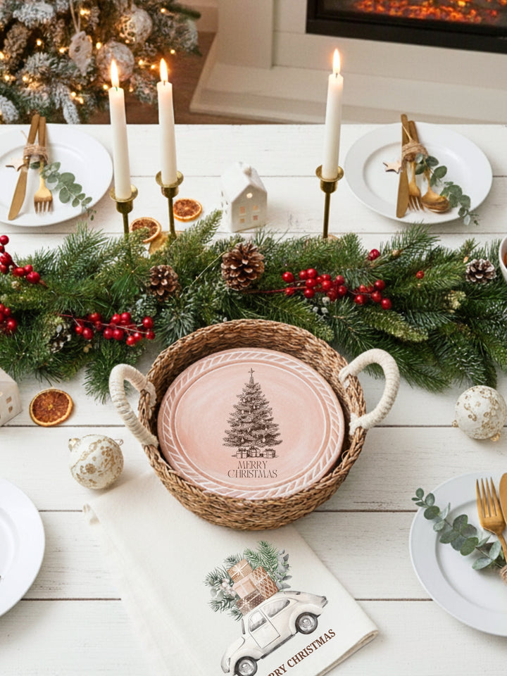 Bring the warmth of the season to your table with our charming Christmas Tree Bread Warmer & Woven Basket set and Tea Towel Set. This isn't just a kitchen accessory; it's a celebration of holiday gatherings, designed to keep your bread warm and your celebrations full of good cheer. The set features a terracotta warmer with a cheerful Christmas tree design, ready to be heated and placed inside the basket. The warmer fits snugly within a handwoven, sustainably sourced basket, creating a rustic and inviting display that perfectly complements your holiday decor. It's ideal for festive dinner parties, holiday meals, or simply enjoying fresh, warm bread on a chilly winter evening. This set is a beautiful and functional addition to any home during the Christmas season.
